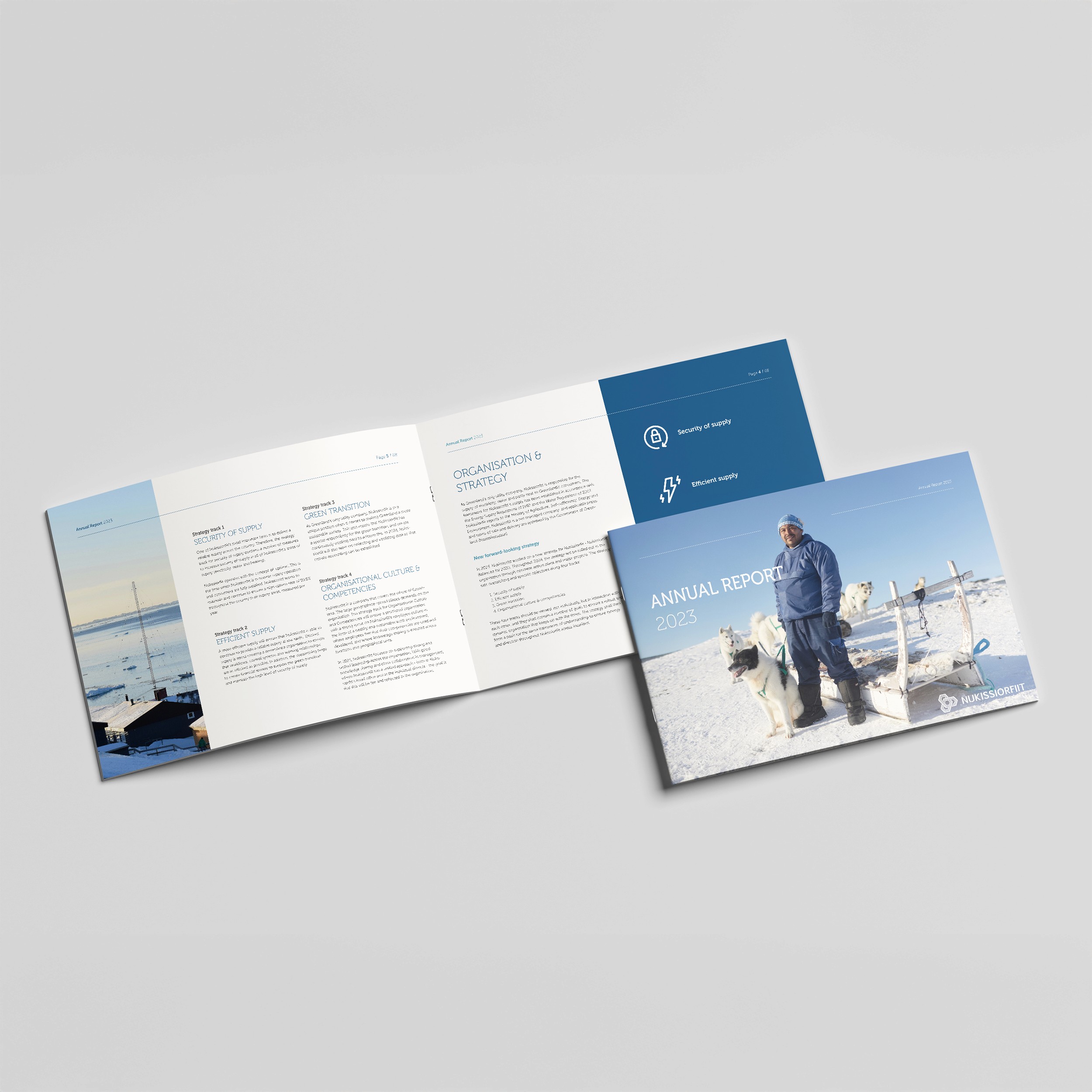 Jeg har udviklet et nyt layoutdesign og tilpasset Nukissiorfiits visuelle identitet med fokus på at skabe et professionelt og stedspecifikt udtryk. Grønlands unikke landskab og farver er integreret i designet for at afspejle virksomhedens lokale forankring og rolle som energiforsyning. Rapportens layout skulle tilpasses en version på dansk, engelsk og grønlandsk.